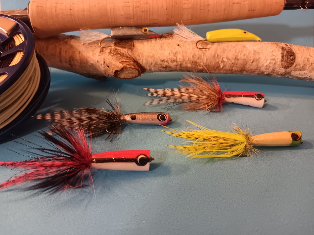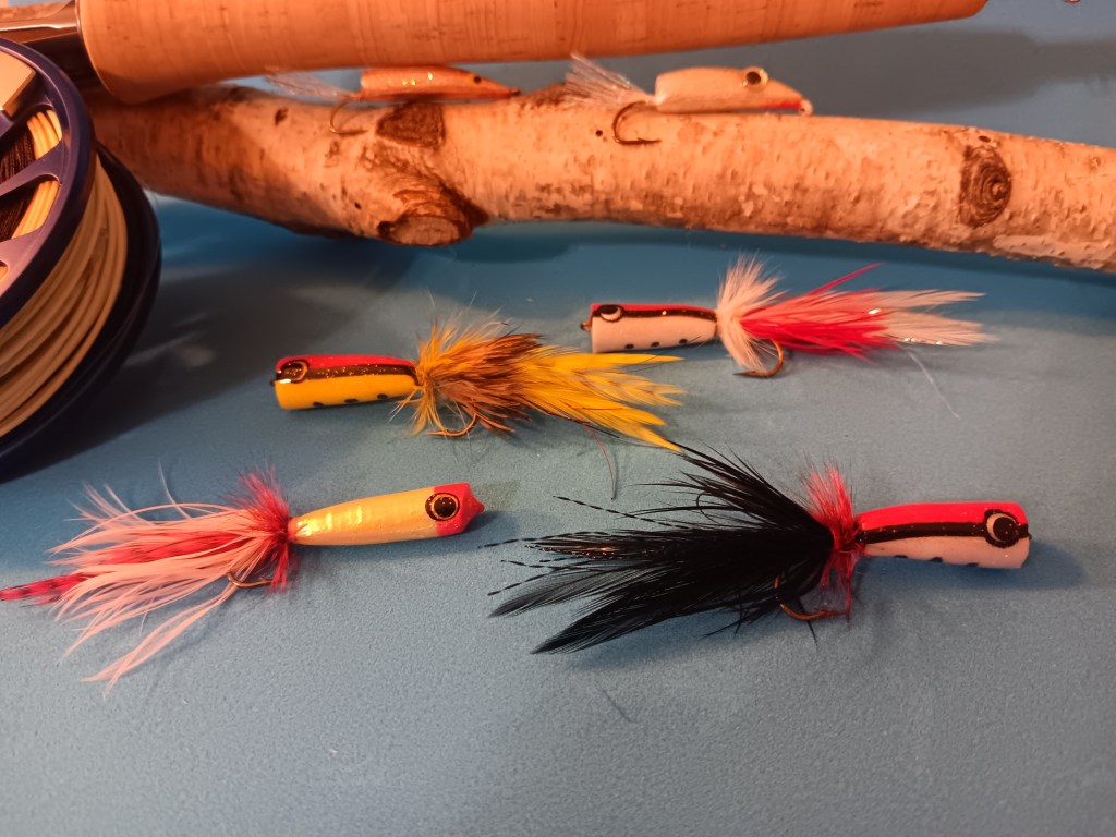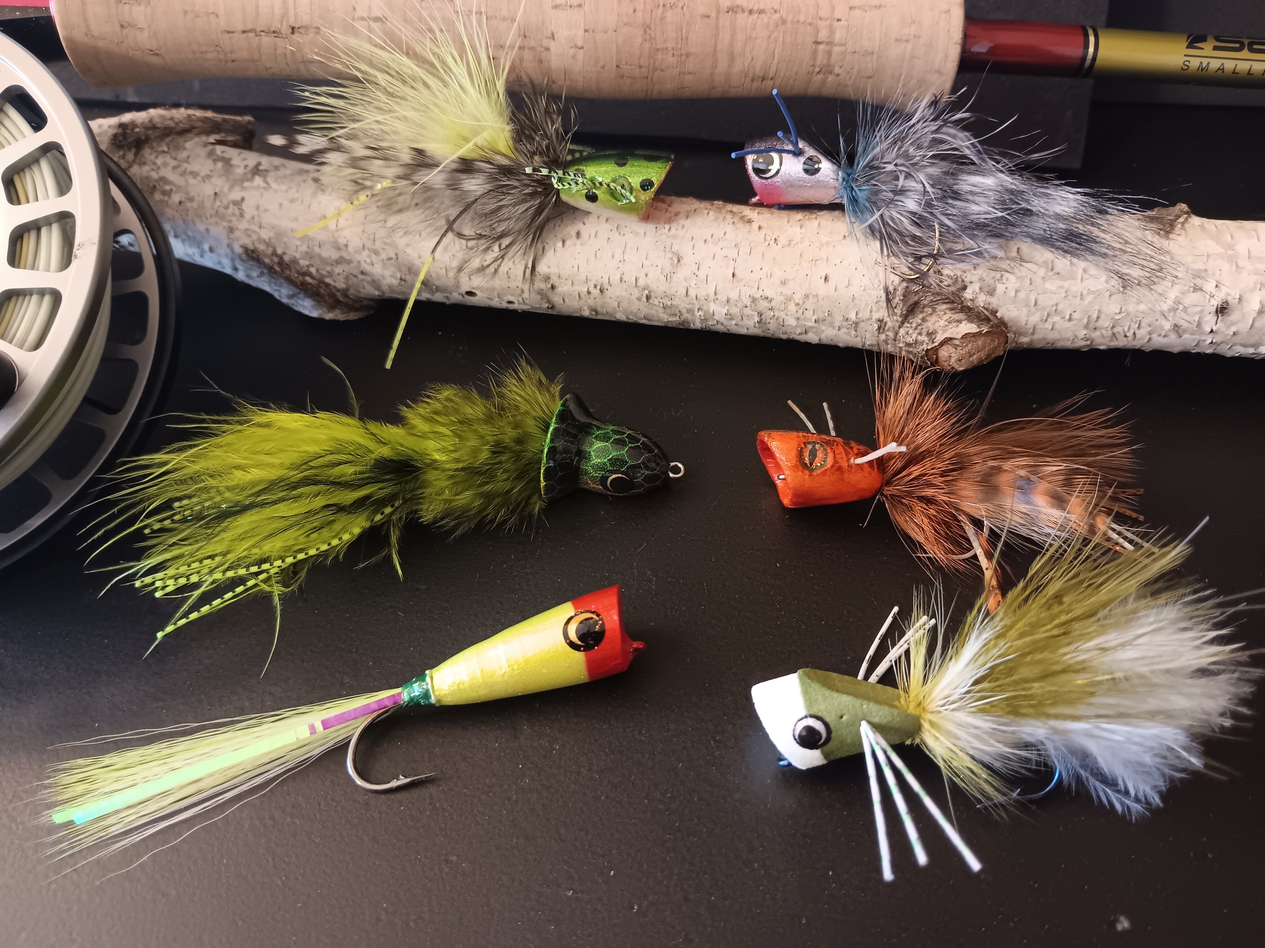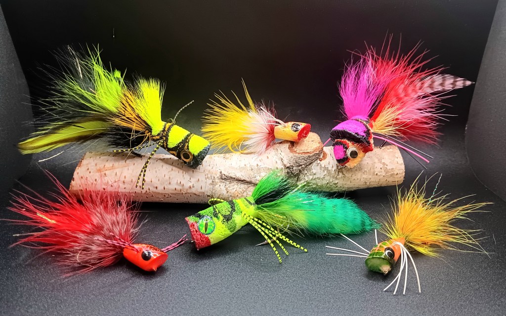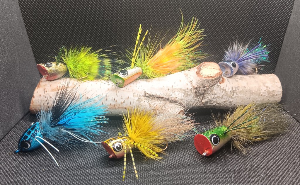 This set includes 2 deer hair bugz, 1 deer hair diver, and 3 Krebs poppers. All in custom mixed colors. Hook size proportionate to popper head which will ensure a good hook set.
