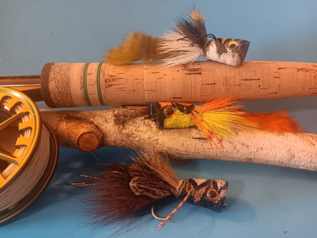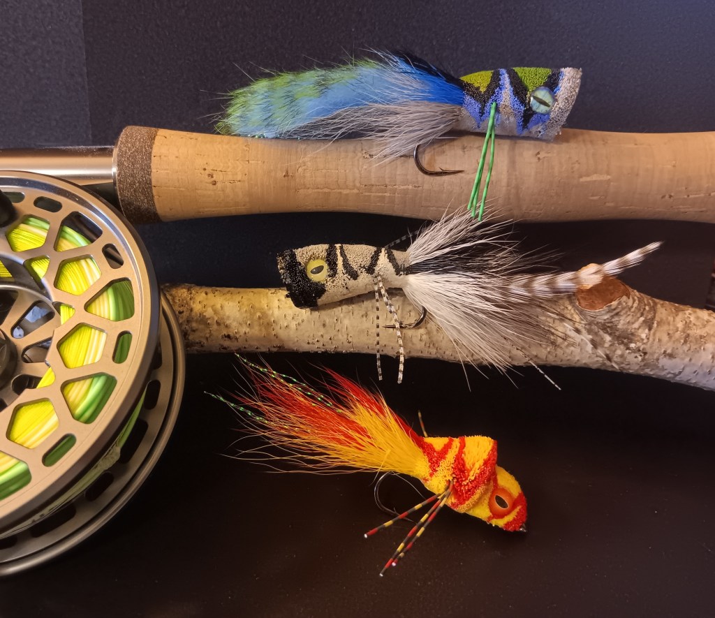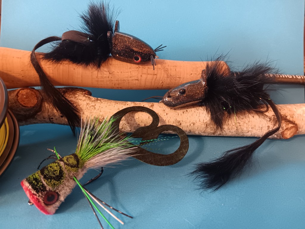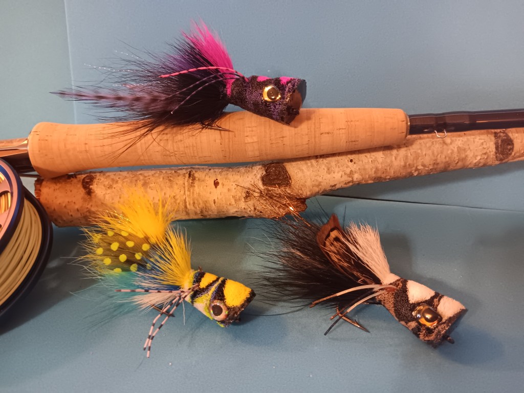 This set includes 2, 1/0 custom deer hair poppers. A frog popper with articulated legs and a Fire Tiger popper. Also included in this set is a 1/0 River Rodent slider with a custom foam slider head.