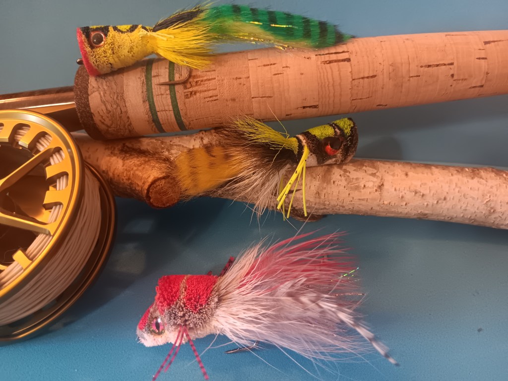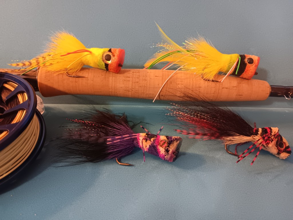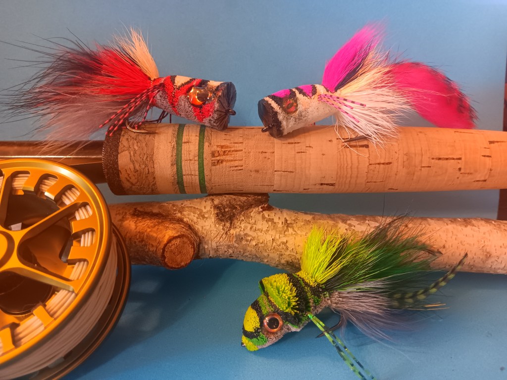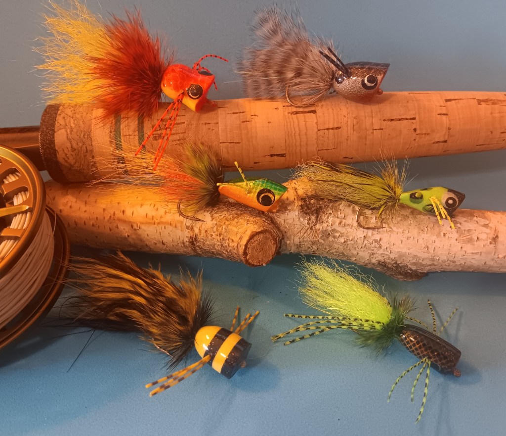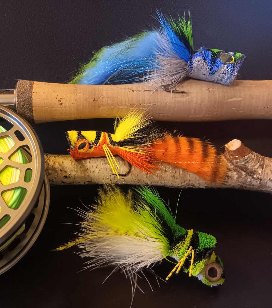This set includes 2, 1/0 custom deer hair poppers. A frog popper with articulated legs and a Fire Tiger popper. Also included in this set is a 1/0 River Rodent slider with a custom foam slider head.